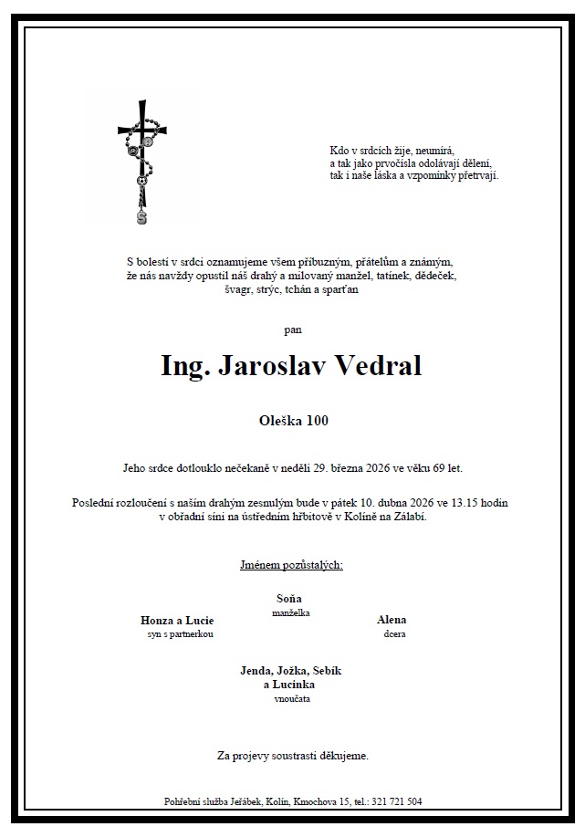 Bohužel musíme s hlubokým zármutkem oznámit, že nás ve věku 69 let, dne 29.3.2026 náhle opustil Ing. Jaroslav Vedral, člen výkonného výboru OFS Kolín a předseda TJ Sokol Horní Kruty.